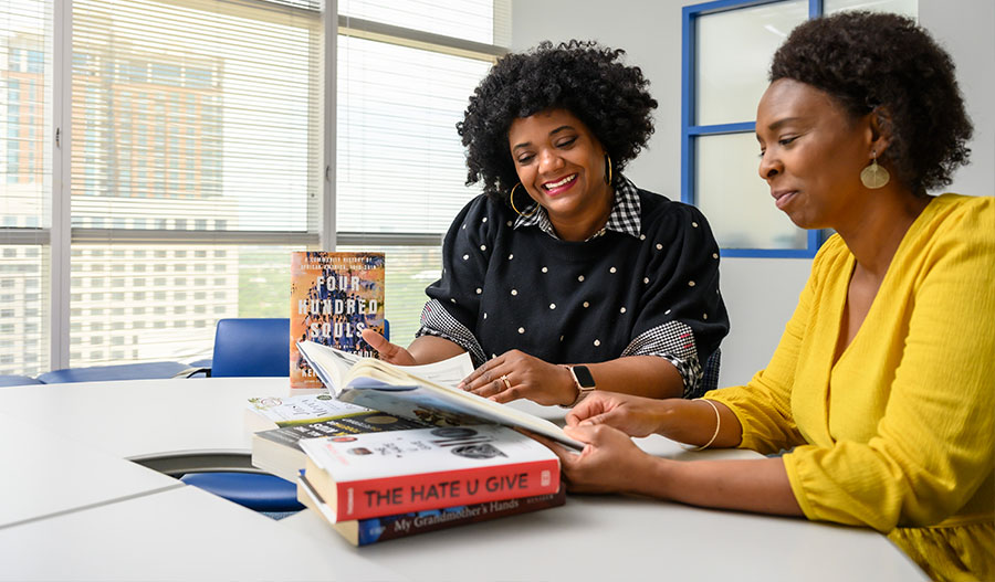 Clinical psychologists Gia Washington, PhD, left, and Ashley Butler, PhD, look over books used to help book club members provide culturally appropriate care to Black patients and families.