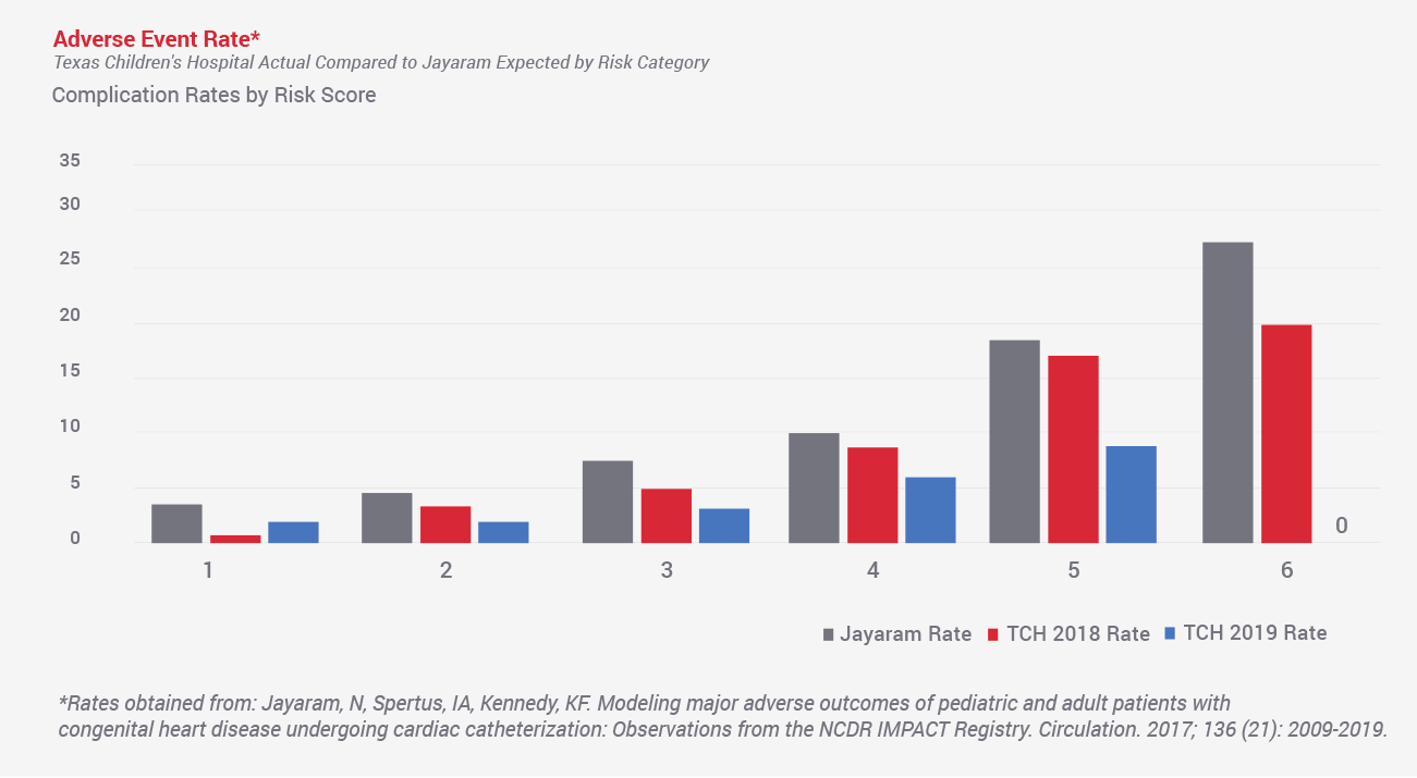 The Interventional Cardiology team also has a clear focus on outcomes and quality. The team’s expertise spans from common disease management to less common, highly complex patient conditions. Implementation of pre- and post-procedure risk assessment has become a standard for every patient we care for. That assessment, combined with close monitoring of our complication data, allows our team to compare our outcomes to national benchmarks. Our adverse event rate has been consistently less than the national benchmark in all risk categories and these rates continue to improve over time.