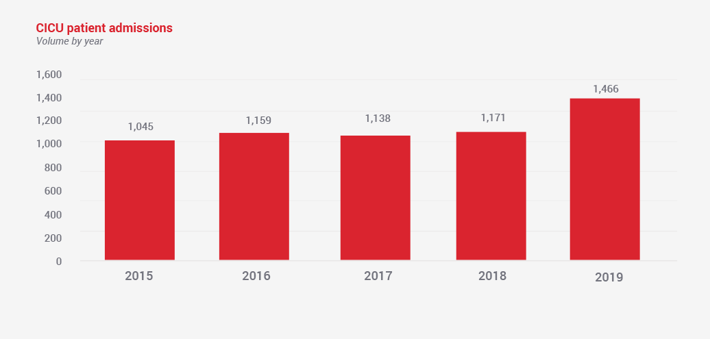 The CICU environment includes 54 patient beds, allowing us to further expand our subspecialty focus for critically ill children with heart disease. We have a 12-bed dedicated Heart Failure Intensive Care Unit, the first of its kind in the nation, which focuses on the treatment of children with heart failure and those requiring intensive care before and after heart transplant including both durable and temporary mechanical circulatory support strategies. In 2019, we offered both pulsatile and continuous durable ventricular assist device support to patients allowing for optimal recover and rehabilitation while awaiting heart transplantation. In addition, we have a neonatal CICU which cares for newborns before and after cardiac surgery. The creation of a neonate-oriented environment with strong focus on their developmental care, while attending to the specific needs of their families, helps optimize the patient’s post-operative growth and development.