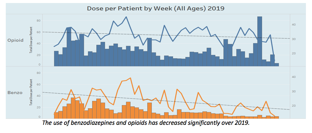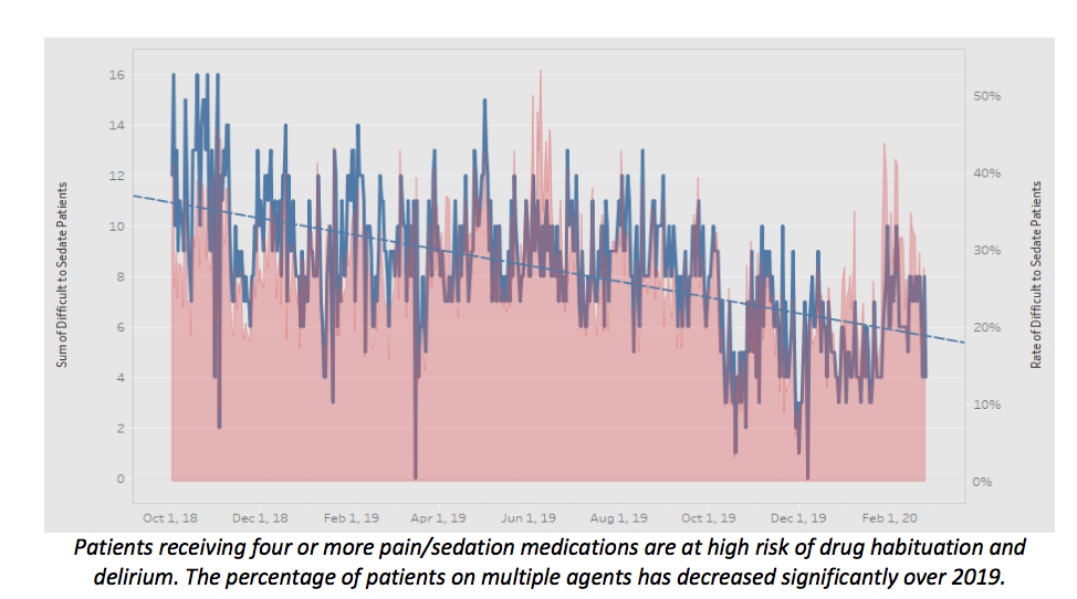 A primary focus in the critical care of post-operative patients is comfort, pain management and safety of medical devices. Emerging clinical and outcomes data has shown that unchecked sedation and pain control practices can lead to prolonged length of ICU stay and can have deleterious neurodevelopmental effects for pediatric patients in the CICU. The team of experts committed to reduction in use of sedative medications utilize various data visualization platforms to help our providers make informed data driven decisions at the point of care. The physicians, providers and pharmacists utilize a number of medication dashboards to ensure that use of sedatives in CICU is focused and dosed, according to standardized protocols. The dashboards organize data for each individual patient and enable clinicians to view exposures and customize strategies in weaning plans. Ongoing evaluation of aggregate data has shown that use of dashboards and review has led to a 30% decreased exposure and 20% reduction in use of multiple sedative agents.
